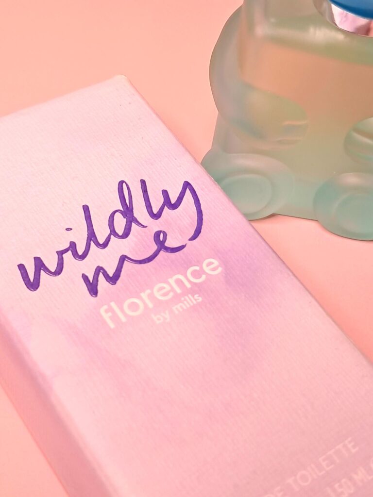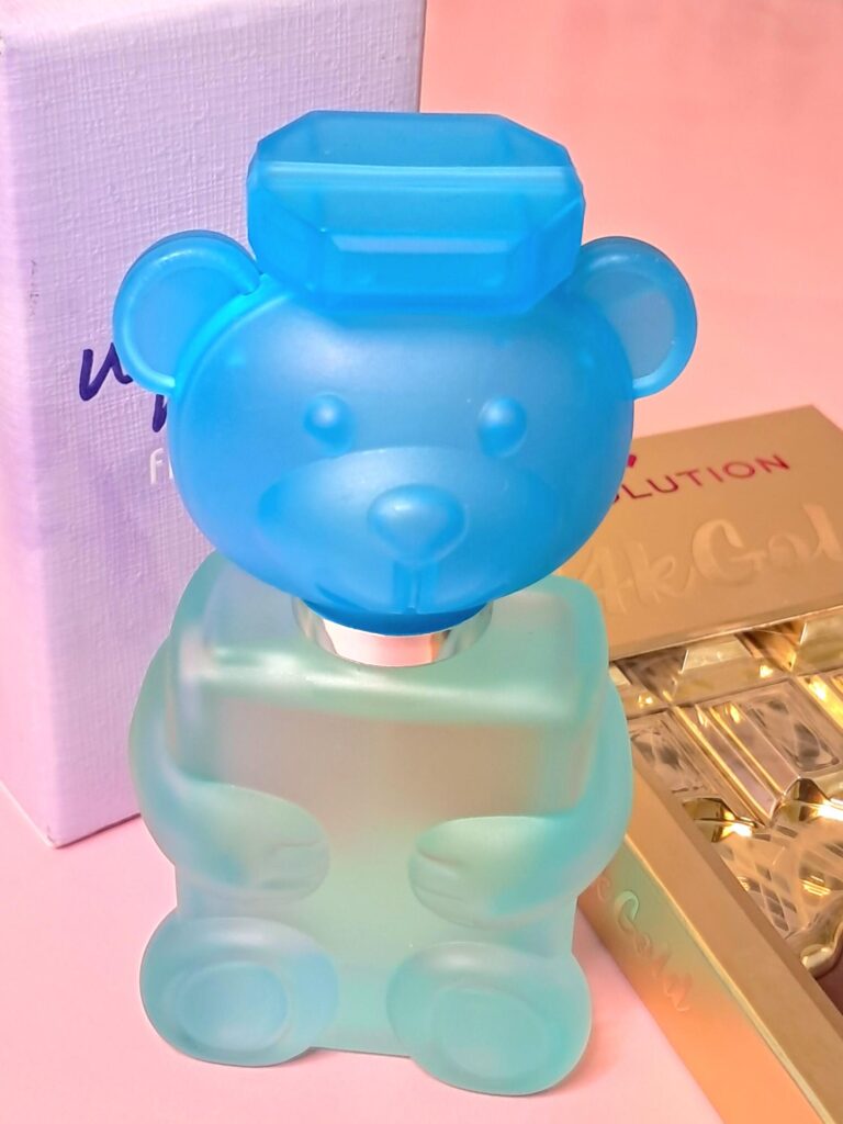 There’s a certain fashion brand who houses their fragrance in bottles shaped a little like this one. This fragrance comes in a super cute teddy bear shaped bottle. Frosted blue in colour, so you can see the fragrance inside. The head is the lid, comes off ready to use the spray top to dispense the scent. Chunky, easy to hold and fun.