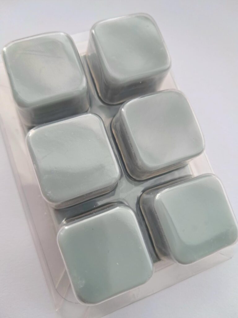 This wax melt is what I call a wax melt snap bar. It’s made up of 6 chunky squared cubes which you break off to use. Sage green in colour, plain, but the fact its exactly the same colour as the packaging for some reason makes something so simple look really good.